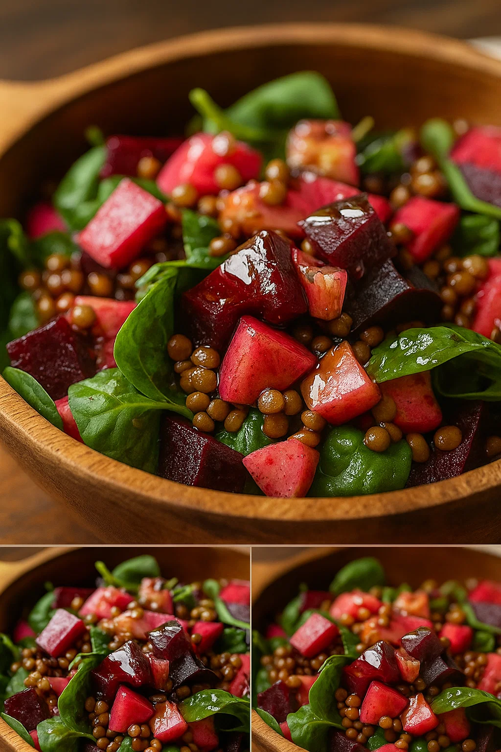 Insalata di barbabietole, spinaci e lenticchie con miele e vinaigrette balsamica