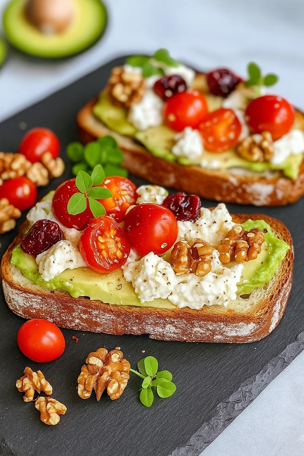 Toast all’avocado con feta, pomodorini, mirtilli rossi e noci
