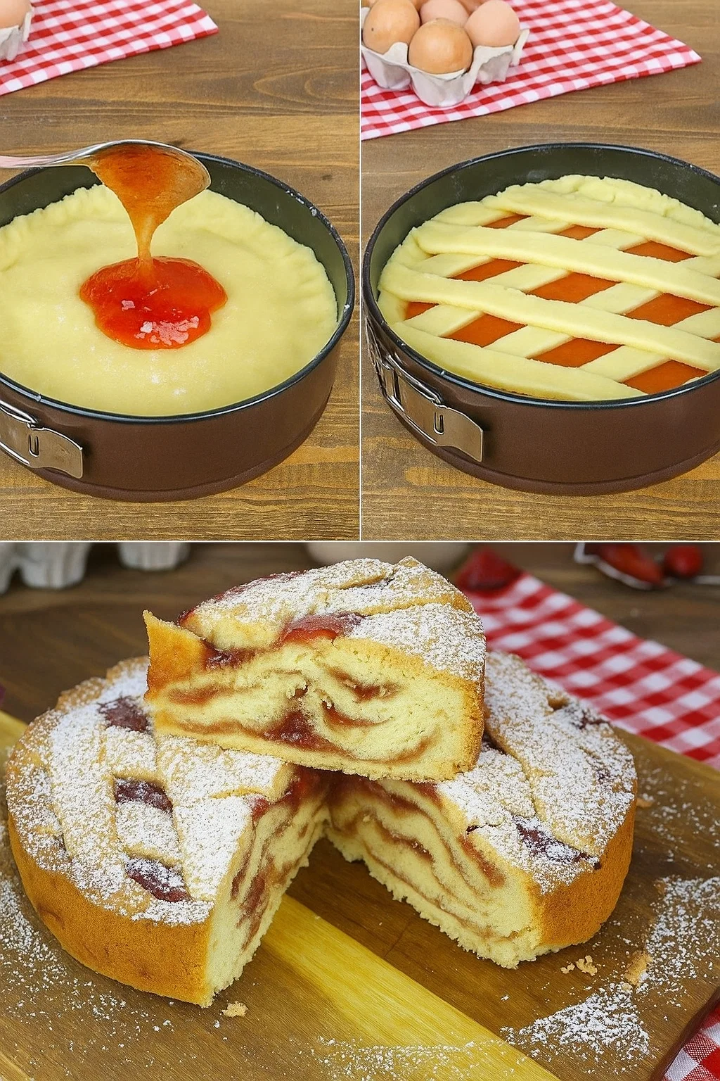 Questa versione è completamente fuori dal comune: non usiamo una sola base, ma tre strati di pasta frolla, intervallati da marmellata. Il risultato? Ogni morso è un mix irresistibile di morbidezza, croccantezza e frutta.